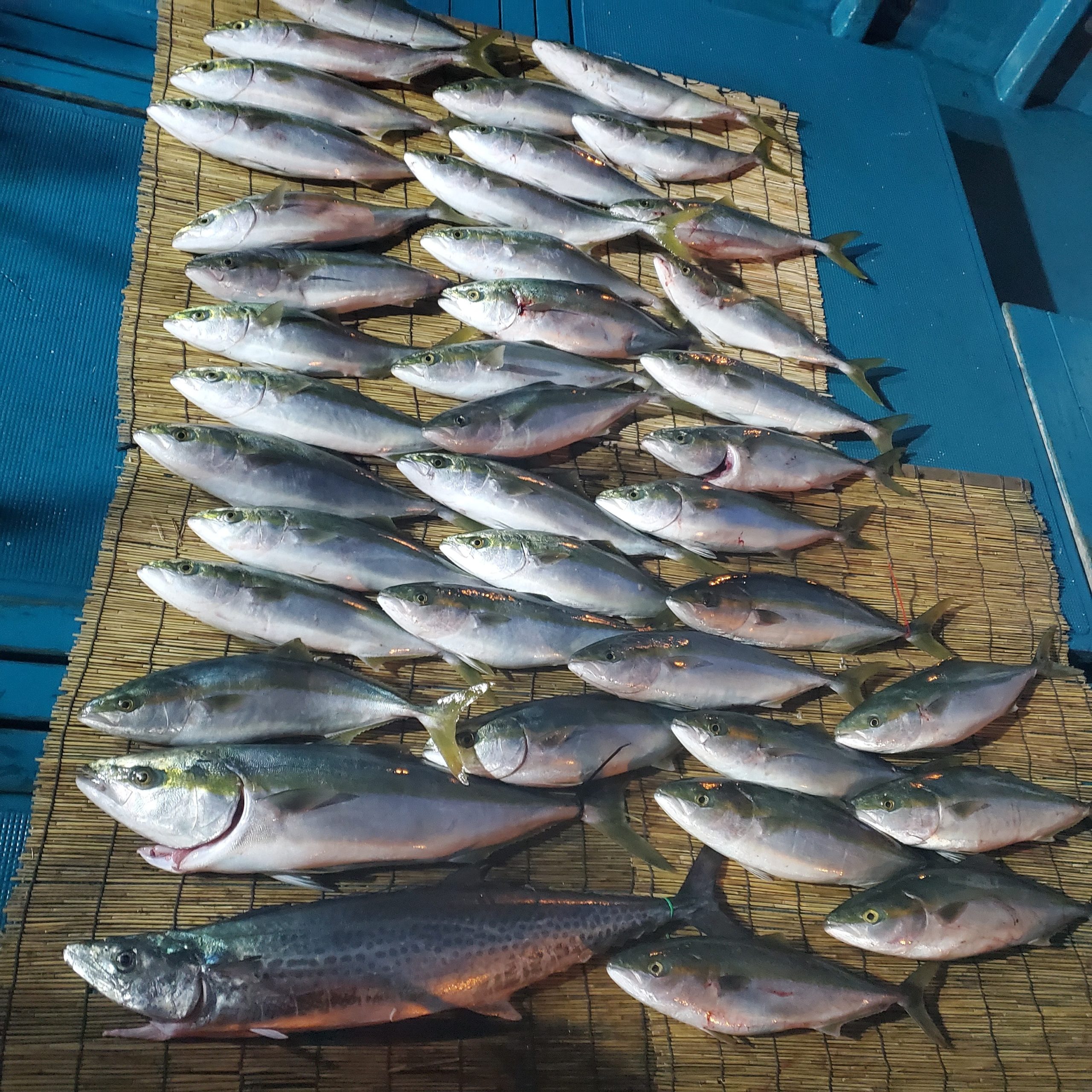 2021-01-11 虎丸船長 釣れた魚: 青物 竿頭(数):じぎんぐ 大きさ(㎝/㎏):ジギング 本日は、午前便は渋々でしたが寒い中釣って頂きありがとうございました。全員安打出来ずすいませんでした。また、リベンジお待ちしてます。 午後便は前半渋々でしたがラストスパートで入れ食いになり全員安打出来て良かったです。 本日はありがとうございました。