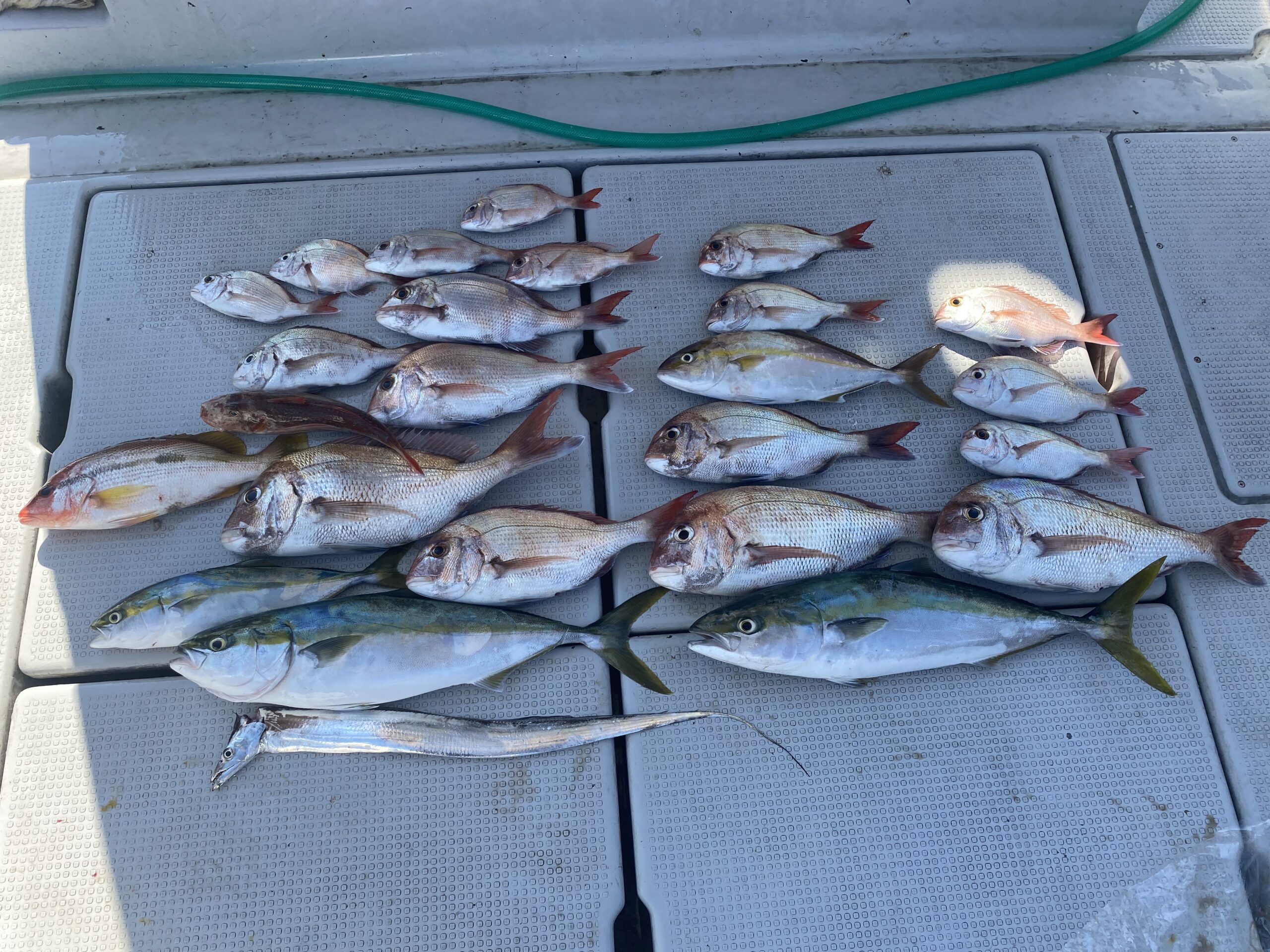 9/27釣果報告 本日もライトジギング+タイラバ釣行でした😃 本日は、風がやや強い予報だったので、前日にお客様と相談させて頂いた結果、出船の運びとなりました😊 本当に、ありがとうございます🙇♂️ 遠方から来られるお客様もいらっしゃるので是非釣って頂きたい🙏 6:00前に出船し、ポイントへ向かうと羽山島を超えると、まあまあの風と波・・・💦 今日は、操船+魚を〆るのがやっとで写真を撮れませんでした🙏 ブリらしき大型も掛かりましたがラインブレイクで2回バレてしまいました。残念・・・ 最終的にハマチ2匹、マダイ9匹、40cm弱のアコウ2匹、サゴシ1匹でした。 いい釣果とならず申し訳ありませんでした🙏 本日は、遊漁船流星をご利用頂き誠にありがとうございました🙇♂️ またのご利用をお待ちしております😊
