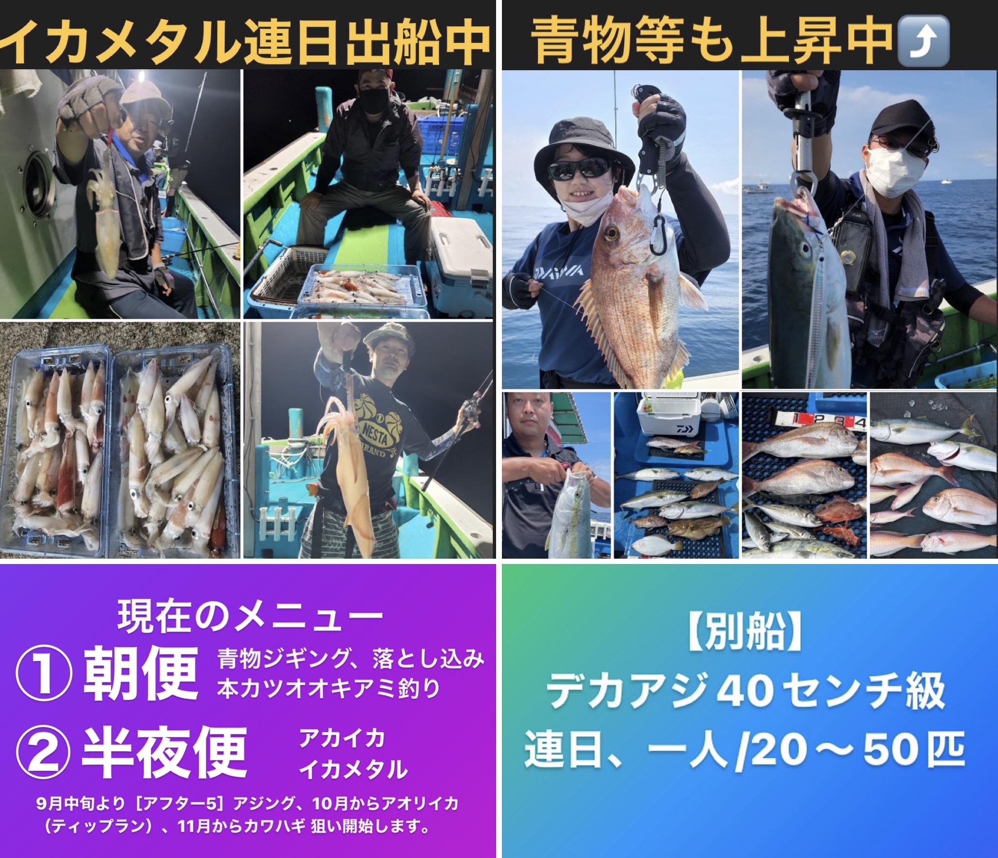 9/28釣果報告 本日もライトジギング釣行でした😃 まずはSLJ(ブレードゲーム)から開始😁 サゴシやマダイ、トラフグがつれましたが、う〜ん💦って感じでした・・・ それからポイント移動してライトジギングに変更😃 ハマチは釣れませんでしたが、ヤズが流す毎に爆釣でした✨✨ ※後半は、〆るのが大変で写真撮影無しとさせて頂きました😅 本日は、遊漁船流星をご利用頂き誠にありがとうございました🙇♂️ またのご利用をお待ちしております😊