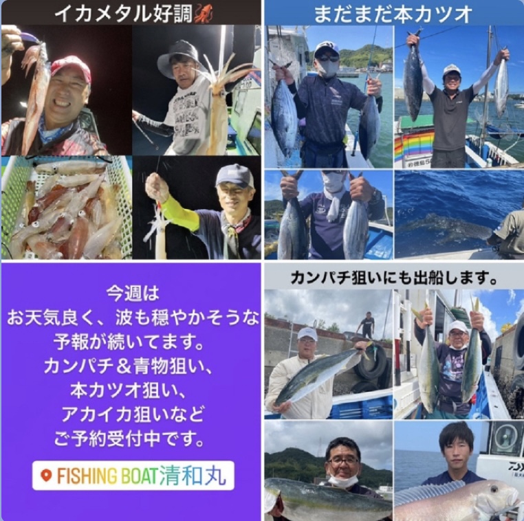 9/27釣果報告 本日もライトジギング+タイラバ釣行でした😃 本日は、風がやや強い予報だったので、前日にお客様と相談させて頂いた結果、出船の運びとなりました😊 本当に、ありがとうございます🙇♂️ 遠方から来られるお客様もいらっしゃるので是非釣って頂きたい🙏 6:00前に出船し、ポイントへ向かうと羽山島を超えると、まあまあの風と波・・・💦 今日は、操船+魚を〆るのがやっとで写真を撮れませんでした🙏 ブリらしき大型も掛かりましたがラインブレイクで2回バレてしまいました。残念・・・ 最終的にハマチ2匹、マダイ9匹、40cm弱のアコウ2匹、サゴシ1匹でした。 いい釣果とならず申し訳ありませんでした🙏 本日は、遊漁船流星をご利用頂き誠にありがとうございました🙇♂️ またのご利用をお待ちしております😊