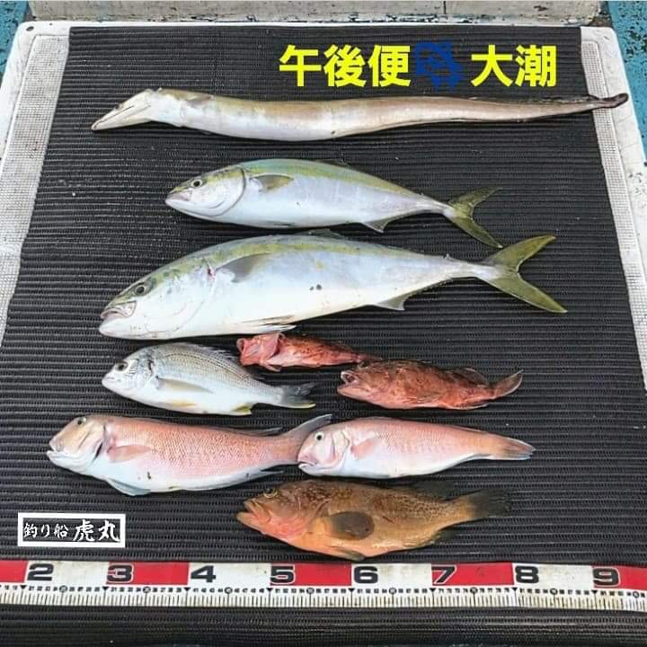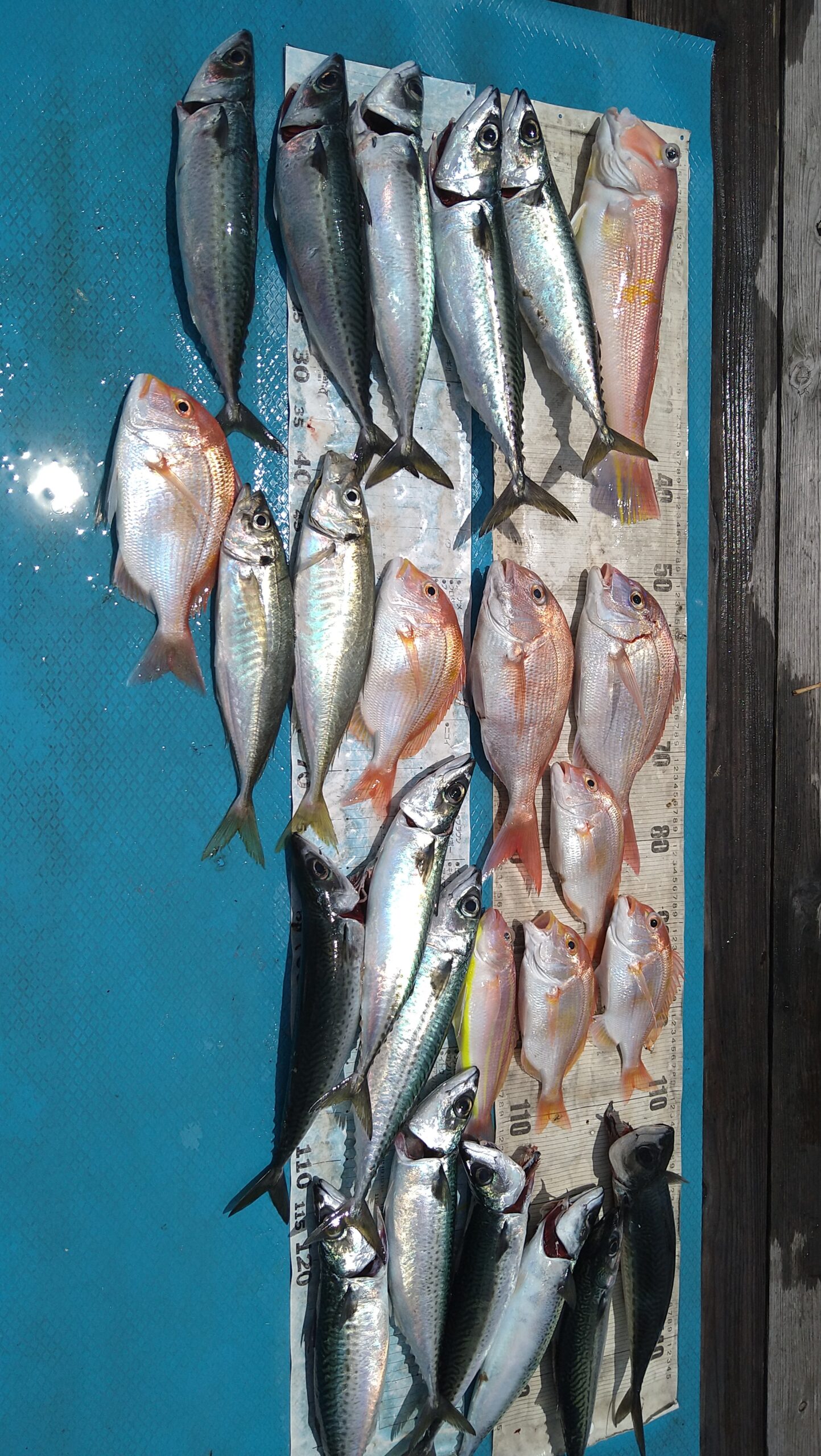 9/27釣果報告 本日もライトジギング+タイラバ釣行でした😃 本日は、風がやや強い予報だったので、前日にお客様と相談させて頂いた結果、出船の運びとなりました😊 本当に、ありがとうございます🙇♂️ 遠方から来られるお客様もいらっしゃるので是非釣って頂きたい🙏 6:00前に出船し、ポイントへ向かうと羽山島を超えると、まあまあの風と波・・・💦 今日は、操船+魚を〆るのがやっとで写真を撮れませんでした🙏 ブリらしき大型も掛かりましたがラインブレイクで2回バレてしまいました。残念・・・ 最終的にハマチ2匹、マダイ9匹、40cm弱のアコウ2匹、サゴシ1匹でした。 いい釣果とならず申し訳ありませんでした🙏 本日は、遊漁船流星をご利用頂き誠にありがとうございました🙇♂️ またのご利用をお待ちしております😊