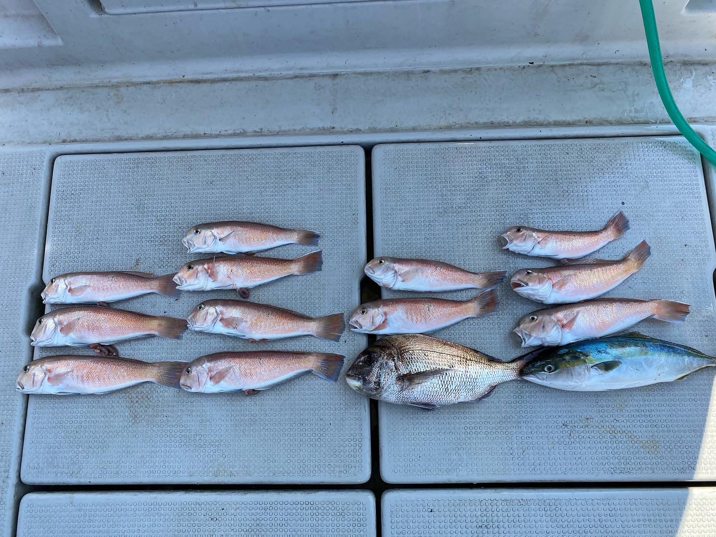 9/27釣果報告 本日もライトジギング+タイラバ釣行でした😃 本日は、風がやや強い予報だったので、前日にお客様と相談させて頂いた結果、出船の運びとなりました😊 本当に、ありがとうございます🙇♂️ 遠方から来られるお客様もいらっしゃるので是非釣って頂きたい🙏 6:00前に出船し、ポイントへ向かうと羽山島を超えると、まあまあの風と波・・・💦 今日は、操船+魚を〆るのがやっとで写真を撮れませんでした🙏 ブリらしき大型も掛かりましたがラインブレイクで2回バレてしまいました。残念・・・ 最終的にハマチ2匹、マダイ9匹、40cm弱のアコウ2匹、サゴシ1匹でした。 いい釣果とならず申し訳ありませんでした🙏 本日は、遊漁船流星をご利用頂き誠にありがとうございました🙇♂️ またのご利用をお待ちしております😊
