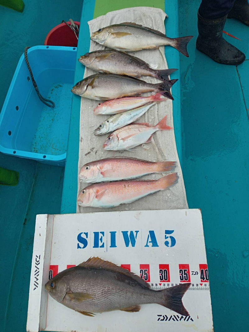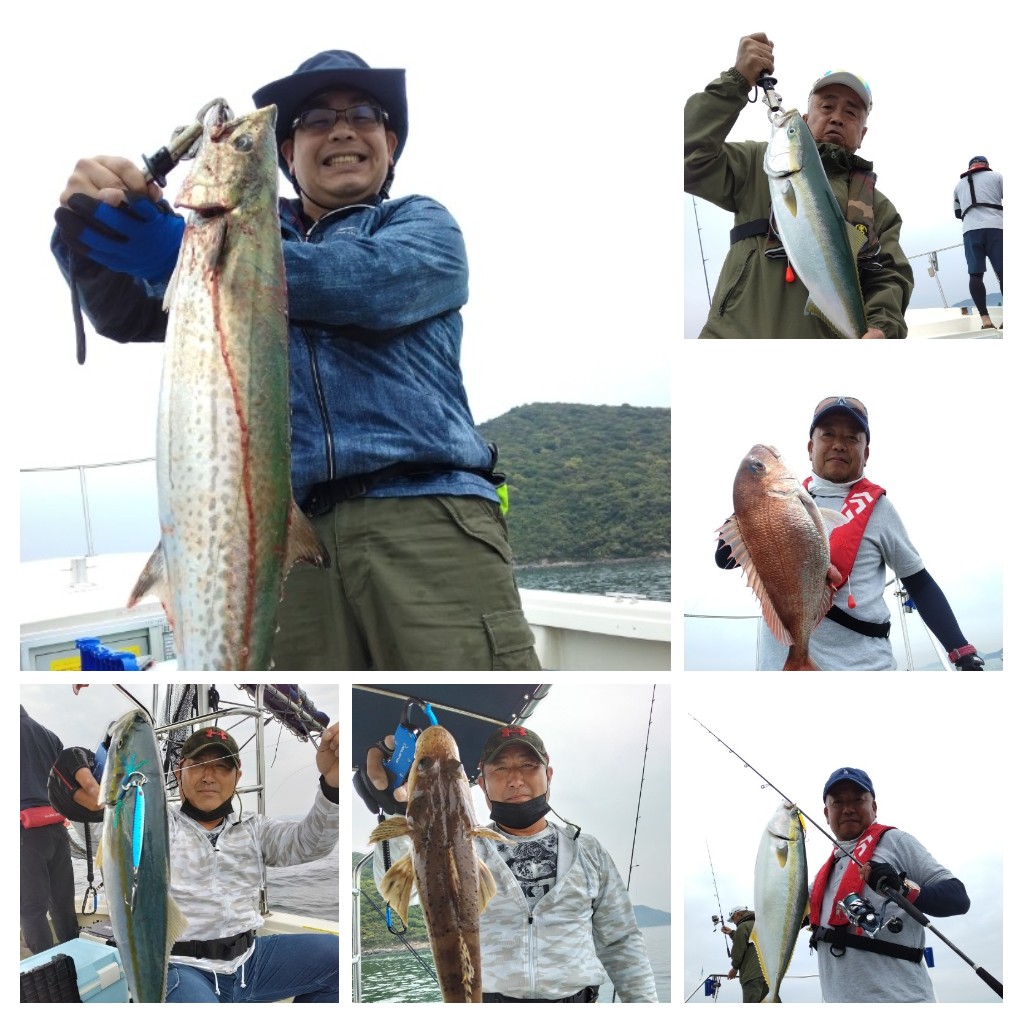 9/27釣果報告 本日もライトジギング+タイラバ釣行でした😃 本日は、風がやや強い予報だったので、前日にお客様と相談させて頂いた結果、出船の運びとなりました😊 本当に、ありがとうございます🙇♂️ 遠方から来られるお客様もいらっしゃるので是非釣って頂きたい🙏 6:00前に出船し、ポイントへ向かうと羽山島を超えると、まあまあの風と波・・・💦 今日は、操船+魚を〆るのがやっとで写真を撮れませんでした🙏 ブリらしき大型も掛かりましたがラインブレイクで2回バレてしまいました。残念・・・ 最終的にハマチ2匹、マダイ9匹、40cm弱のアコウ2匹、サゴシ1匹でした。 いい釣果とならず申し訳ありませんでした🙏 本日は、遊漁船流星をご利用頂き誠にありがとうございました🙇♂️ またのご利用をお待ちしております😊
